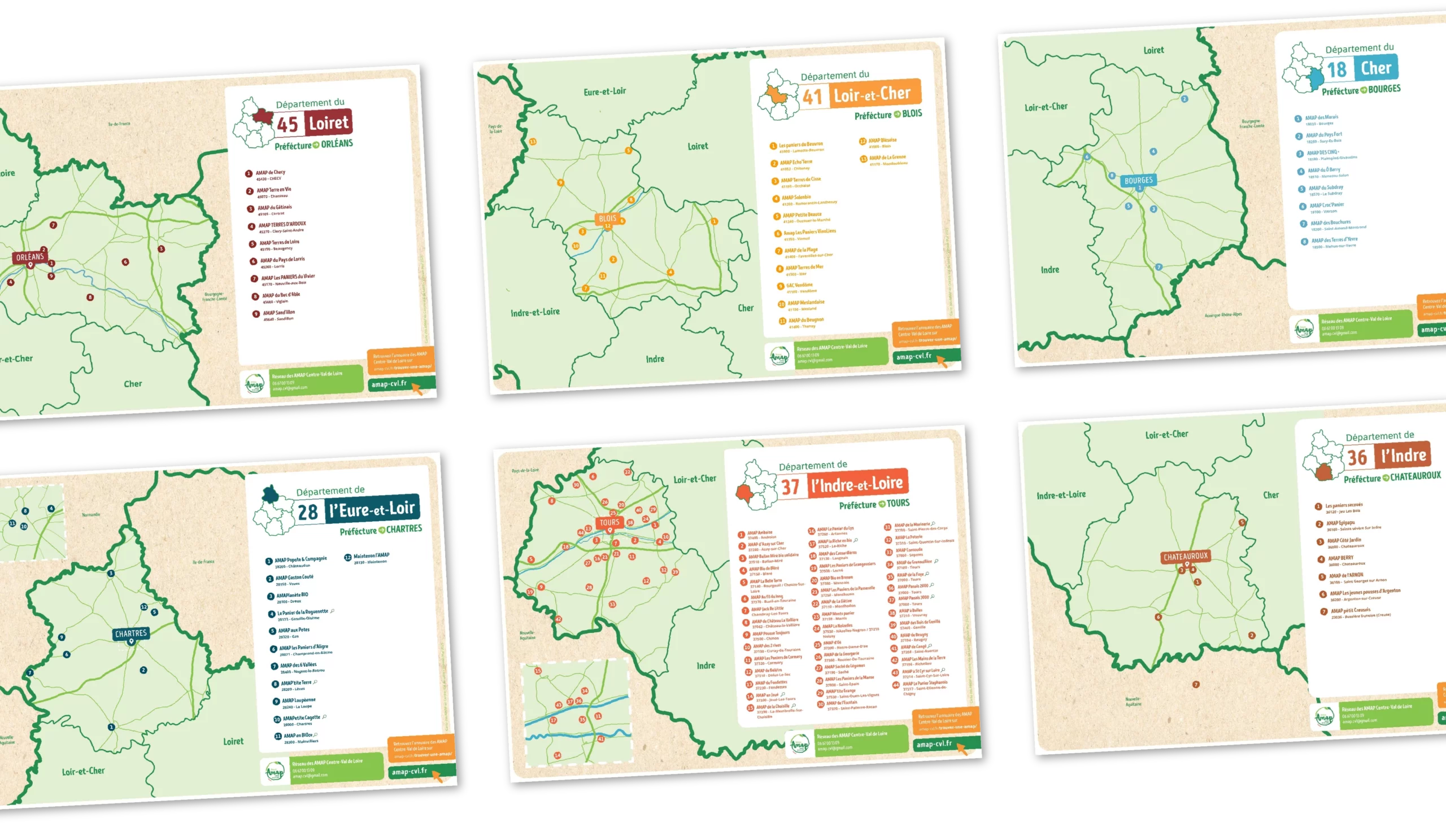 Réalisation de six cartes départementales pour la région Centre-Val de Loire, intégrant la localisation des AMAP.