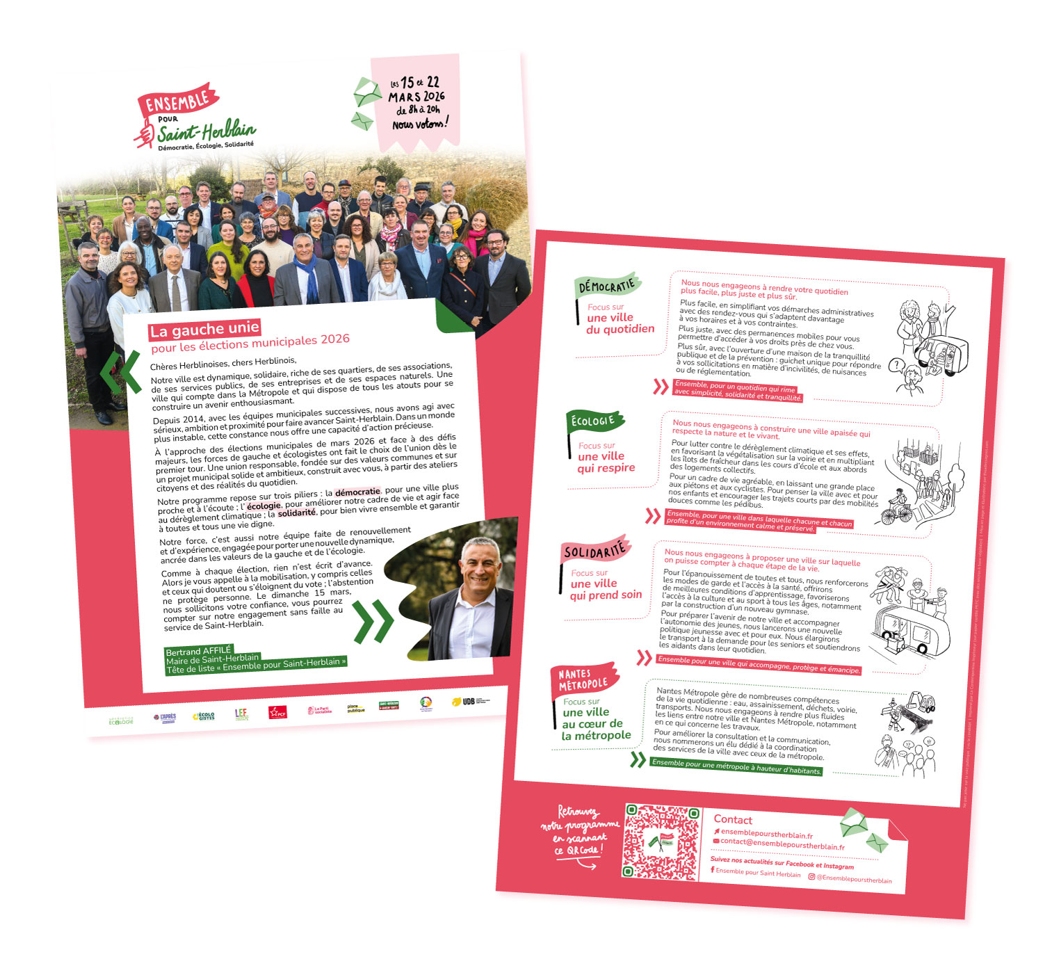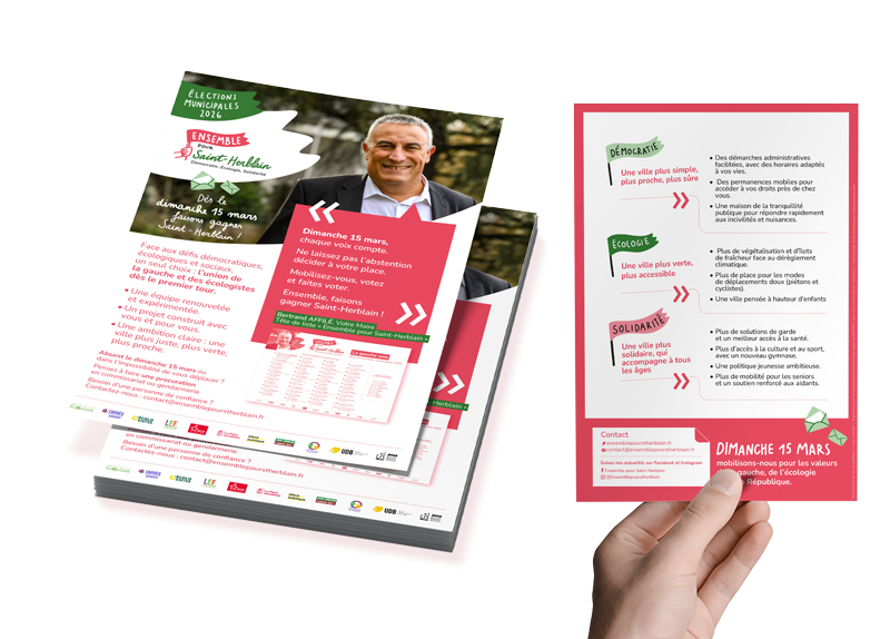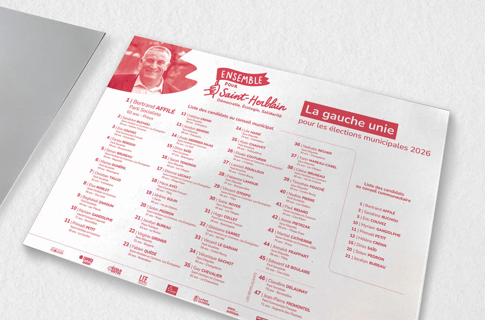 J’ai contribué à la liste Ensemble pour Saint-Herblain en concevant son identité visuelle et en développant ses supports de campagne : bulletin, profession de foi, affiche, programme, tracts, oriflammes, bannières et documents de lancement.